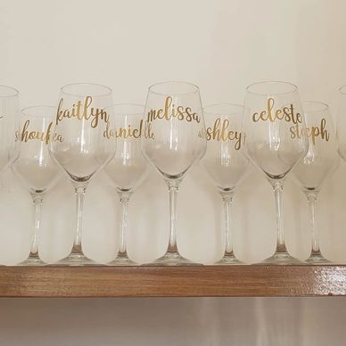 Personalize your drink ware for your home or event. Champagne glasses, wine glasses, coffee mugs, colour changing tumblers and more. Vinyl or etched (glass only) available.